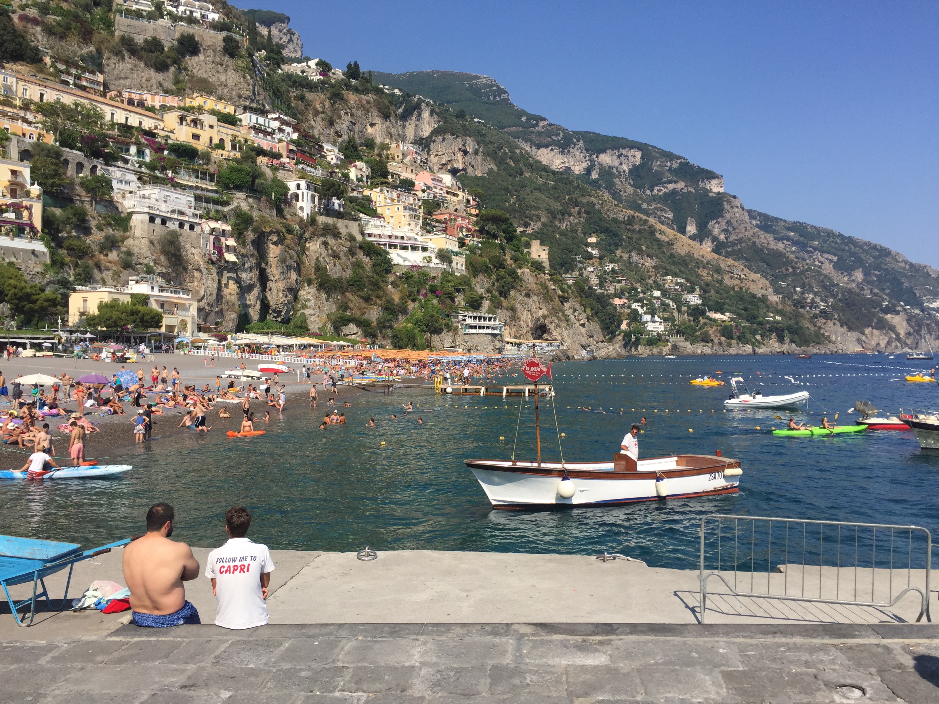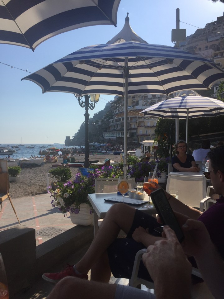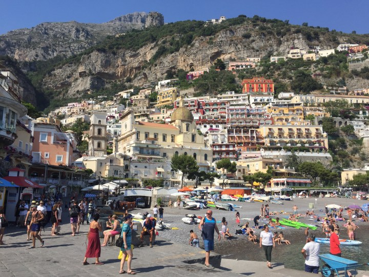 Back in Positano it is clear that the Madonna festival is still on – we can hear the Priest sing with his very croaky voice, using what sounds like a home-made loudspeaker system. Tinny and scratchy. (I am not sure if it is his voice or the loudspeaker, but the sound carries all the way to our apartment). We venture into town following the singing – on the square in front of the Cathedral there is a whole commotion of people, a brass band, children singing and croaky Priest. We settle for dinner at one of the beach front restaurants, and I for a sacrilegious non Italian meal: schnitzel and chips! And for my sins I am punished with the most hideous piece of flattened meat – the crumbs being more substantial than the actual piece of meat, and frozen chips. The pouches of mayo makes it even more disgusting. Revenge of the Italian god of pasta. Victor had Pasta Amatriciana – tomato, pancetta, garlic. The perfect meal. I learnt my lesson.