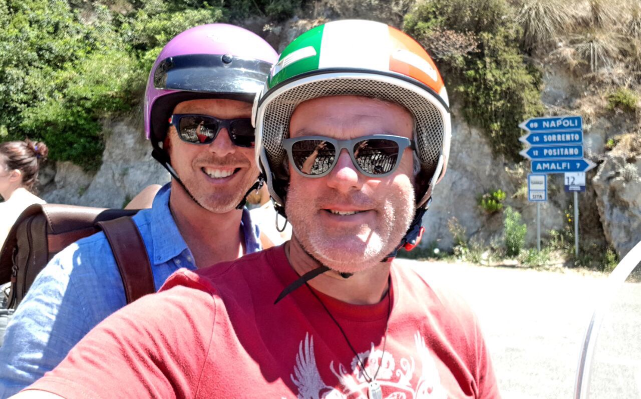 Yesterday, we decided on the spur of the moment to rent a scooter. 60 Euro for 24 hours. The little thing sighs under our weight. Before we can give it too much thought, we are off into the madness of the Amalfi coastal road. (I remember fondly when we were here 12 years ago driving to Ravello how our dear friend Terry got car sick. He was sitting int he back looking either over a steep cliff or seeing a massive bus approach at full speed). The roads are increibly narrow, the drivers incredibly insanely not afraid of anything. A few times I can feel Victor’s entire body go into spasm as he tries to pull in his stomach, his knees clutching to my sides as we just miss an ooncoming bus. Other scooters scoot past us at the speed of light. It must be the most laughable thing to see these two middle aged men perched upon a small little scooter, obviously scared shitless but nevertheless scootering along as if we know exactly what we are doing.
